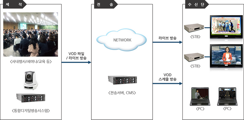 이렇게 제작된 녹화 방송 및 라이브 방송을 네트워크를 통해 셋탑을 이용하여 시청할 수 있다.